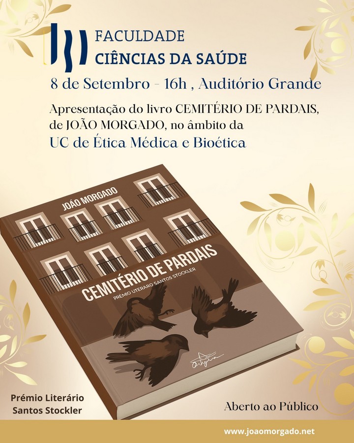O escritor João Morgado, recentemente distinguido com o Prémio Literário Santos Stockler, estará no próximo dia 8 de Setembro, pelas 18h00, no Grande Auditório da Faculdade de Ciências da Saúde da Universidade da Beira Interior (UBI), para apresentar o romance Cemitério de Pardais.